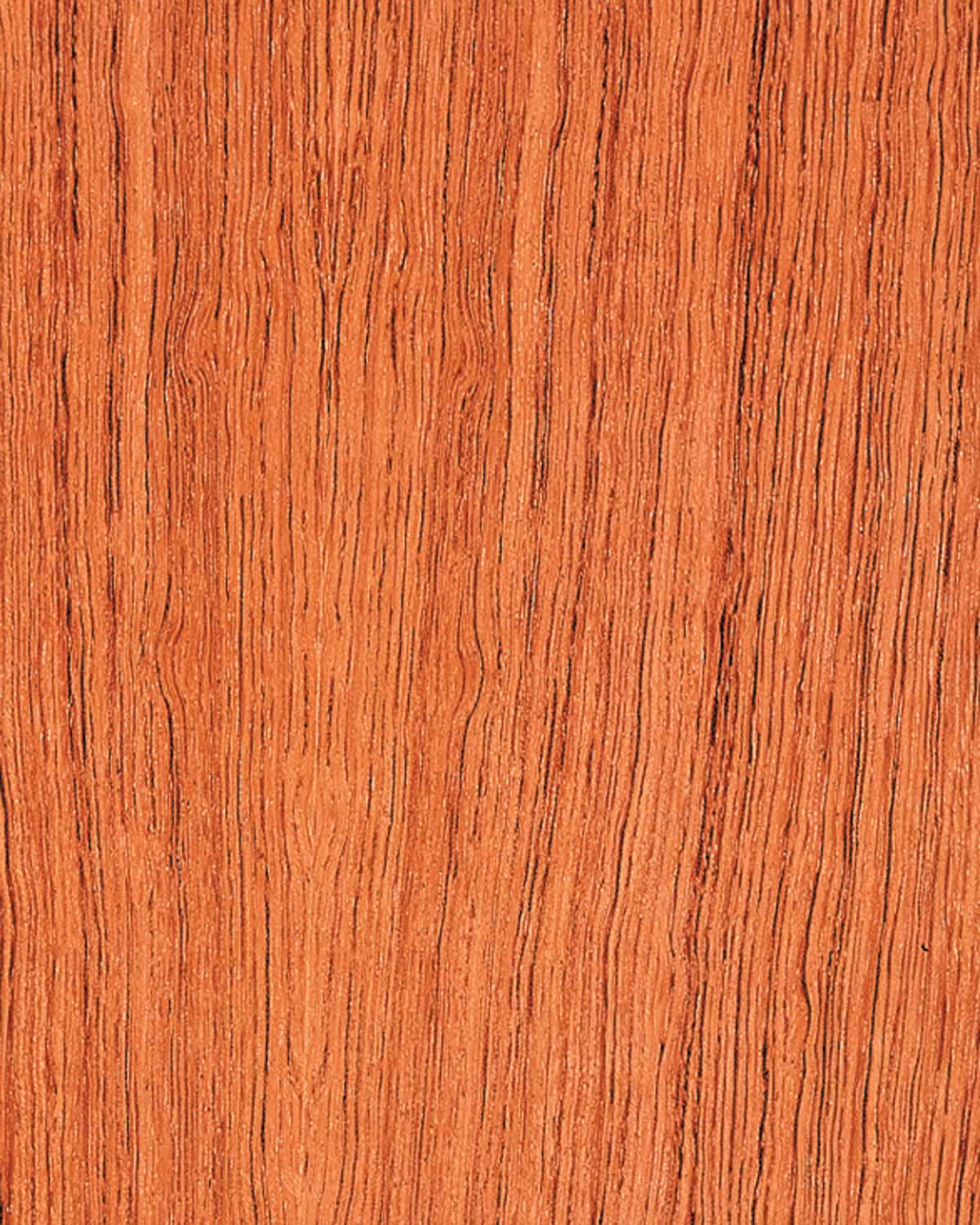 Heartwood ranges from a pinkish red to a darker reddish brown with darker purple or black streaks. Sapwood is a pale straw color and is clearly demarcated from the heartwood. Bubinga is very frequently seen with a variety of figure, including: pommele, flamed, waterfall, quilted, mottled, etc.